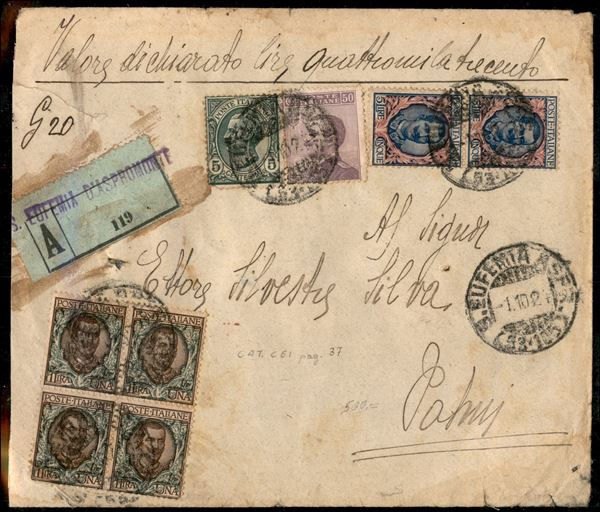 Assicurata lire quattromilatrecento affrancata con quartina 1 lira + coppia 5 lire + 5 cent + 50 cent (77 + 78 + 81 + 85) - da S. Eufemia d'Aspr. per Palmi del 1.10.24