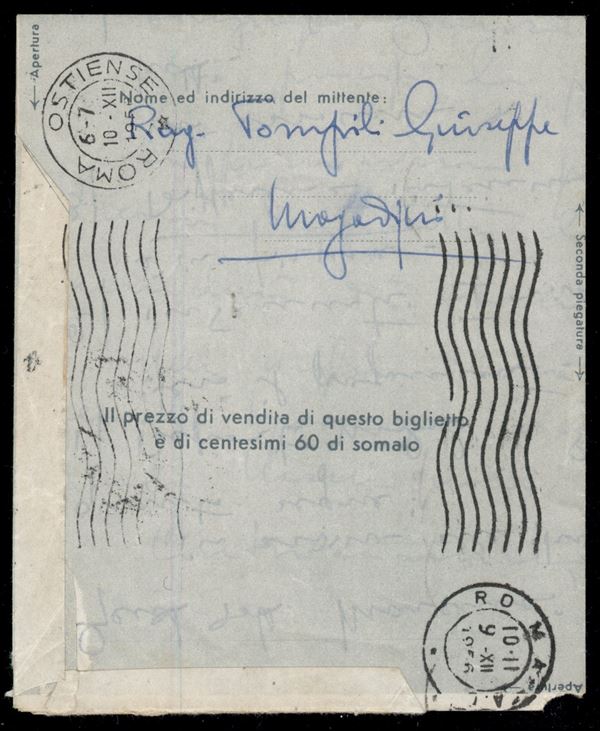Biglietto postale per via aerea da 50 cent (A1) da Mogadiscio a Roma del 8.12.56
