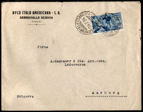Busta affrancata con 1,25 lire Calcio (360) isolato da Serravalle Scrivia per Aarburg con bollo ambulante Genova Alessandria del 20.7.34