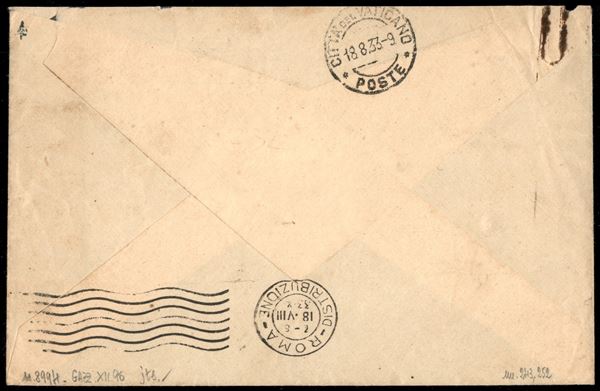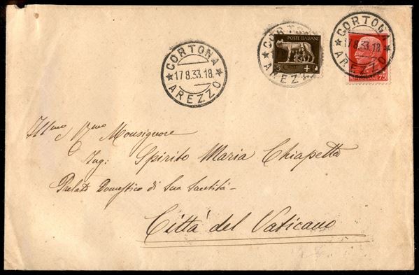 Busta affrancata con 5 cent Imperiale + 75 cent Imperiale (243 + 252) da Cortona per Cittą del Vaticano del 17.8.33 - ex coll. Provera