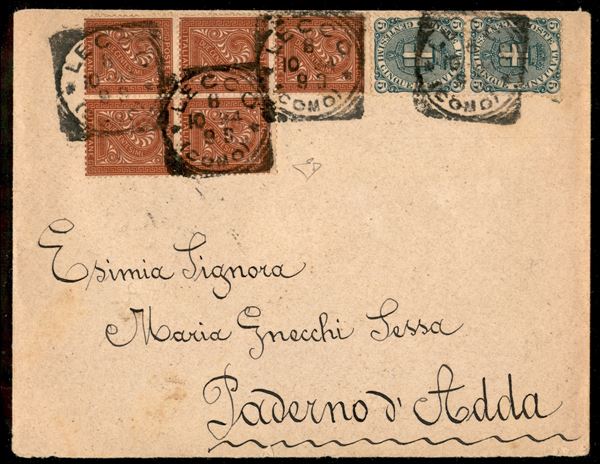 Busta affrancata "Due Re" con blocco di cinque 2 cent (T16) a seggiola + coppia verticale del 5 cent (59) da Lecco per Paderno d'Adda del 8.10.94 - ED