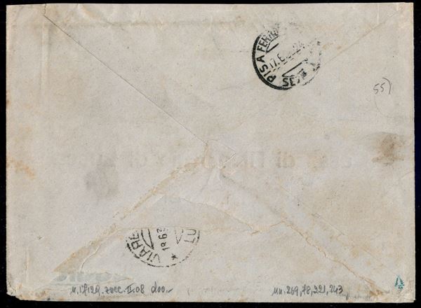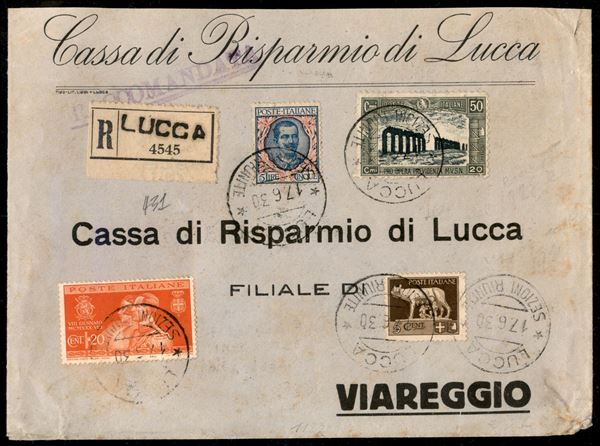 Busta commerciale raccomandata affrancata con 5 lire Floreale (78) + 50 cent Milizia II (221) + complementari (243 + 269) da Lucca per Viareggio - bollo d'arrivo - ex coll. Provera
