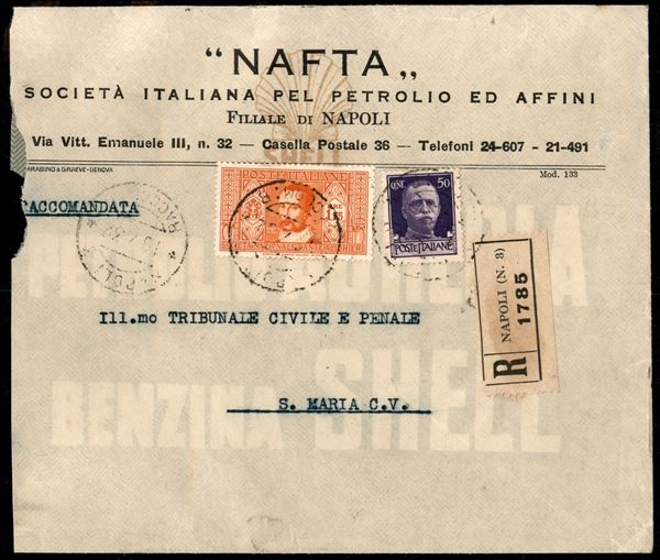 Busta commerciale raccomandata affrancata con 1,75 lire Dante (311) + complementare 50 cent Imperiale (251) da Napoli per S. Maria Capua Venere del 18.7.32 - ex coll. Provera