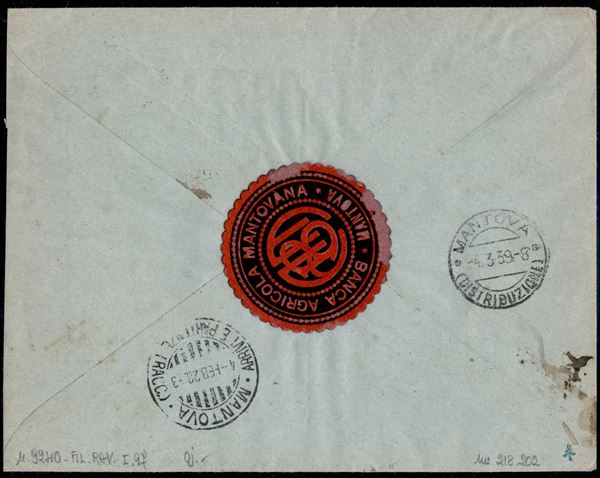 Busta commerciale raccomandata con 50 cent Parmeggiani (218a - bruno e nero intenso) + 1,25 lire Floreale (202) da S. Giacomo delle Segnate per Mantova del 3.2.28 - Raybaudi - ex coll. Provera