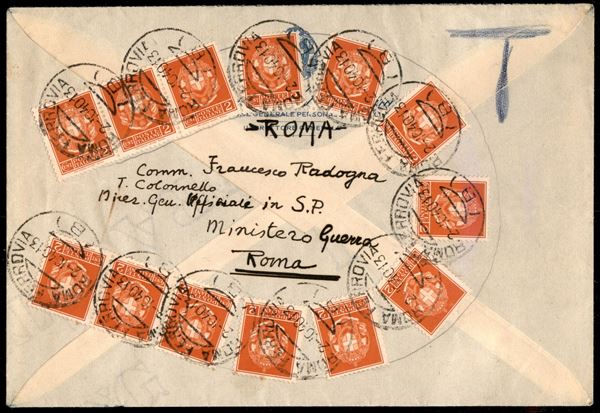 Busta con affrancatura a forma di ferro di cavallo composta da tredici 2 cent Imperiale (242A) da Roma per cittą del 2.10.40 - ex coll. Provera