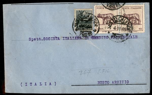 Busta con affrancatura mista - coppia del 50 cent Lupa (515) + 40 cent Democratica (546 - Repubblica) da Sesto Calende a Busto Arsizio - rifilata in basso ed in alto