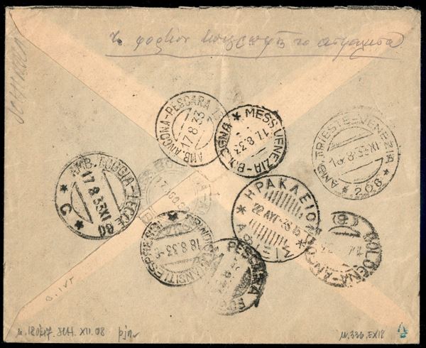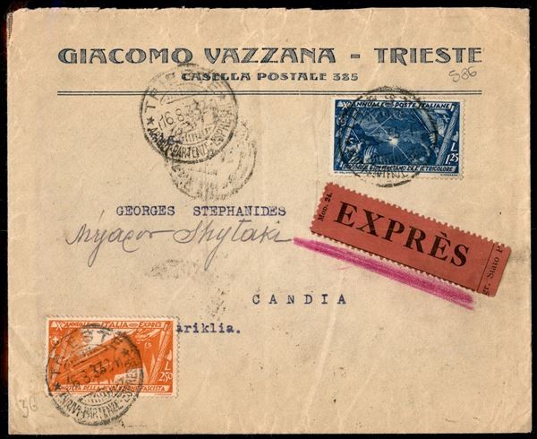 Busta espresso affrancata con 1,25 lire Marcia su Roma (336) + 2,50 lire Espresso Marcia su Roma (E18) da Trieste a Candia (Grecia) del 16.8.33 con diversi annulli di transito - ex coll. Provera