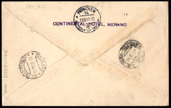 Busta espresso affrancata con 2,55 + 2 lire Augusto (425) + 2,50 lire Espresso (16) da Merano per Monaco del 10.10.37 - bollo d'arrivo