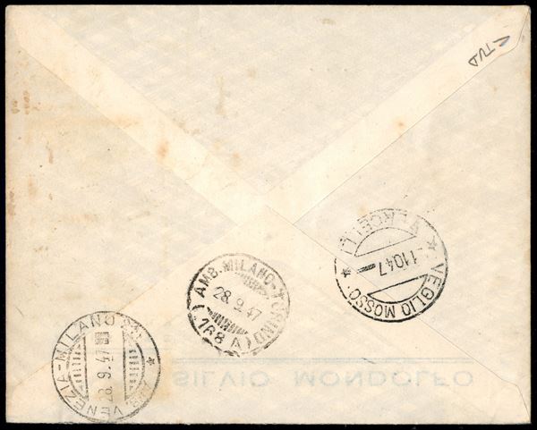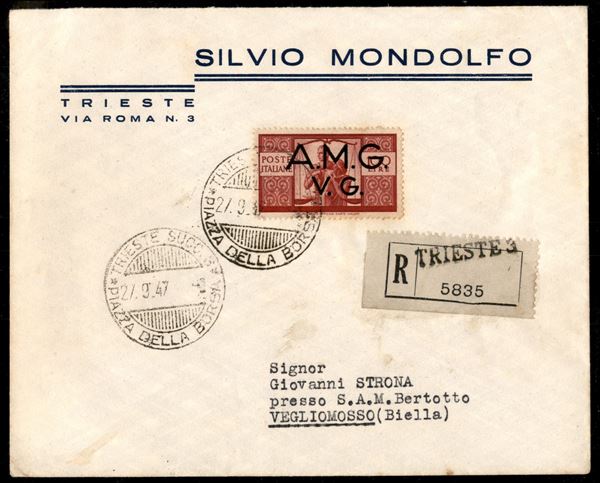 Busta raccomandata affrancata con 100 lire Democratica (21) da Trieste per Vegliomosso del 27.9.47 - bollo d'arrivo