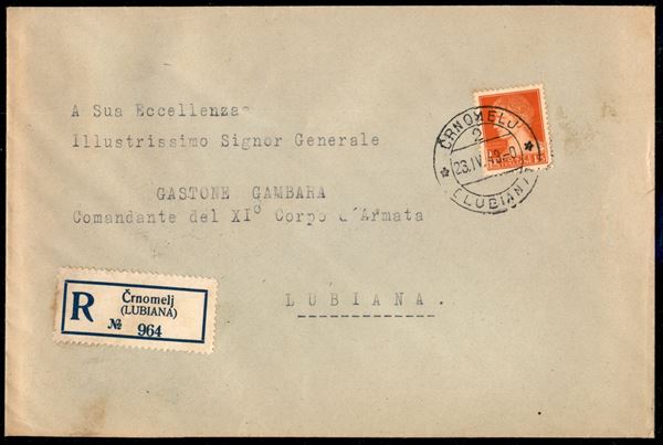Busta raccomandata affrancata con 1,75 lire Imperiale (254 - Regno) da Crnomelj per Lubiana del 23.4.43 - ex coll. Provera