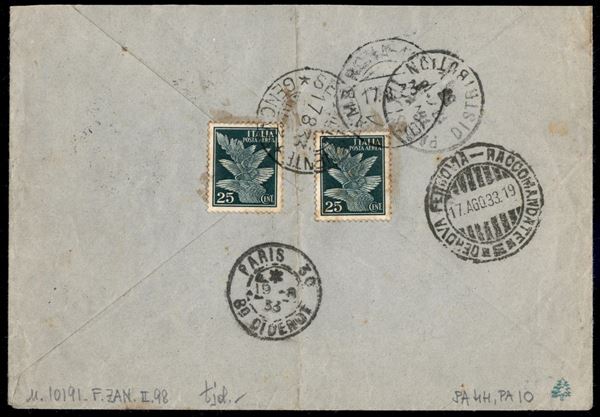 Busta raccomandata affrancata con 2,55 lire Espresso Aereo (44) + due 25 cent Imperiale Aerea (10) al retro da Sestri Levante a Parigi del 17.8.33 - ex coll. Provera