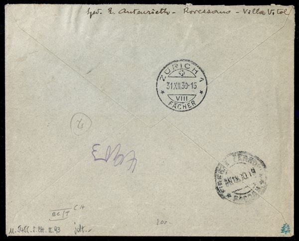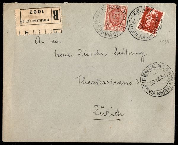 Busta raccomandata affrancata con 75 cent Floreale (201) + 2 lire Imperiale (255) da Firenze per Zurigo del 30.12.30 - ex coll. Provera
