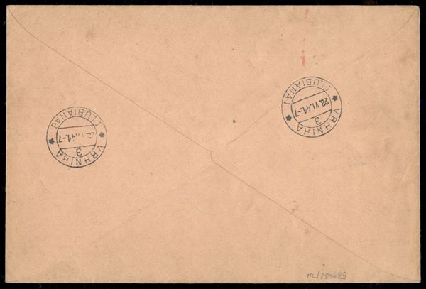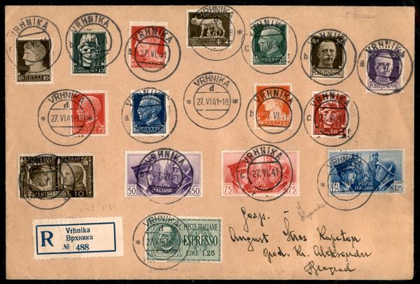 Busta raccomandata affrancata con Imperiale + Fratellanza + Espresso (Regno) 15 valori diversi da Vrhnika a Belgrado del 27.6.41
