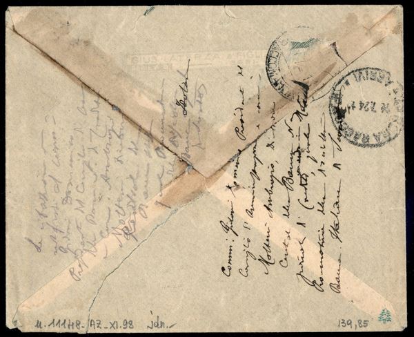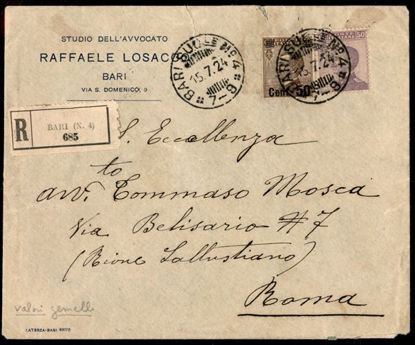 Busta raccomandata affrancata con valori gemelli 50 cent Imperiale (85) + 50 su 40 cent (139) da Bari per Roma del 15.7.24 - ex coll. Provera