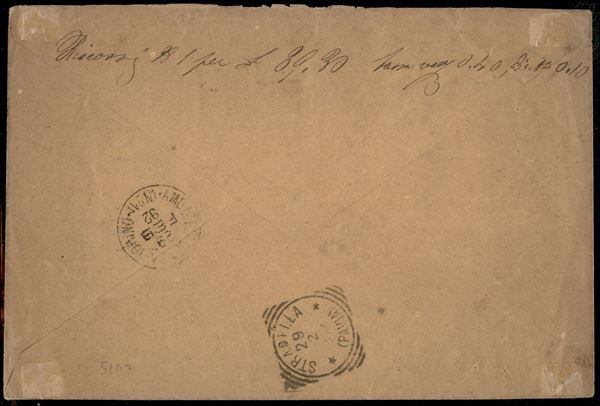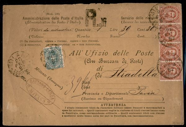 Busta raccomandata delle Poste (Mod. 190) affrancata con striscia orizzontale di quattro 10 cent Umberto (38) + 5 cent Stemma (59) da Milano per Stradella del 28. feb. 92