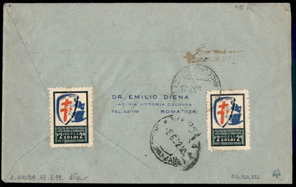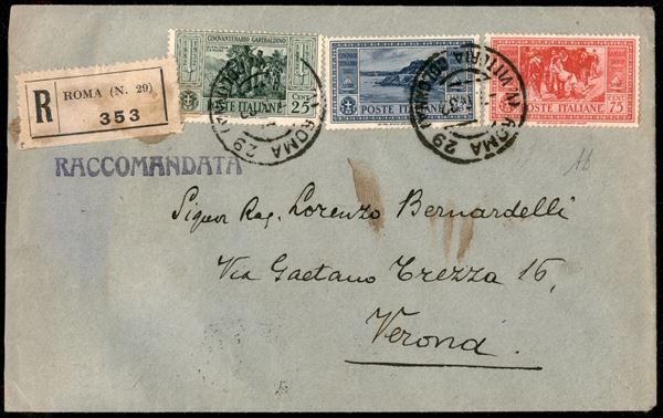 Busta raccomandata tricolore affrancata con 25 cent + 75 cent + 1,75 cent Garibaldi (317 + 320 + 322) da Roma per Verona del 7.6.32 - Alberto Diena - ex coll. Provera