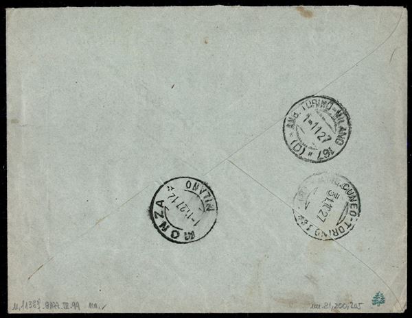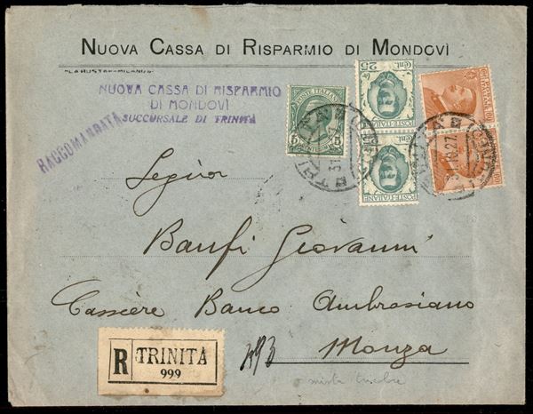 Busta raccomandata tricolore affrancata con 5 cent Leoni (81) + coppia verticale del 25 cent Floreale (200) + coppia orizzontale del 60 cent Michetti (205) da Trinità per Monza del 31.10.27 - ex coll. Provera