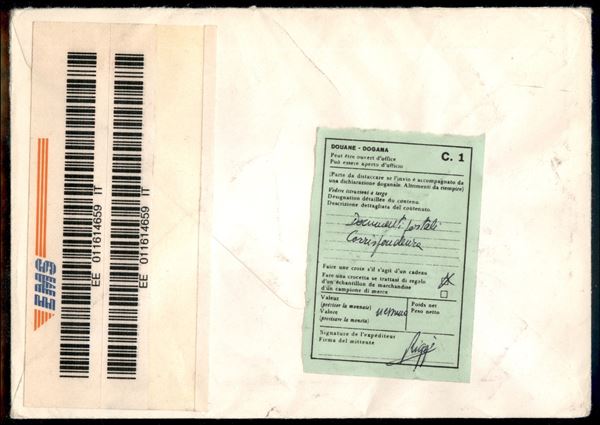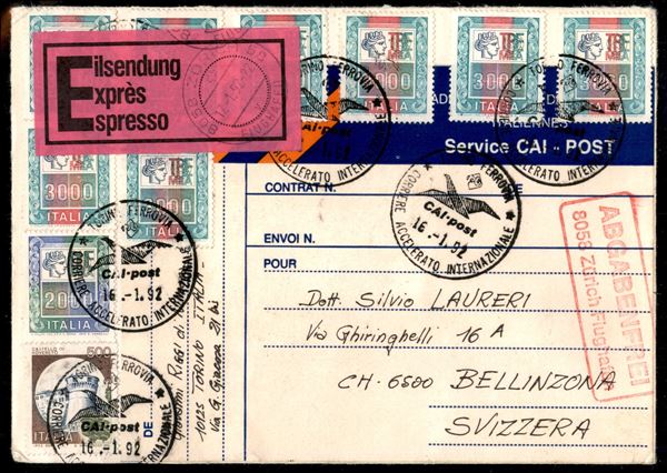 Cai Post - Busta per la Svizzera - da Torino Ferrovia per Bellinzona del 16.1.92 affrancata con otto valori 3000 lire + 2000 lire (alti valori) + 500 lire Castelli - allegato bollettino di accettazione
