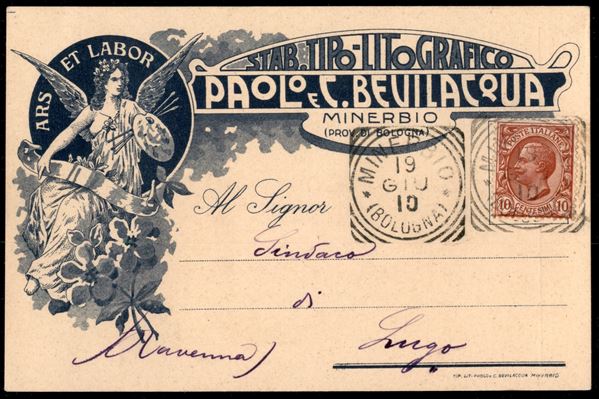 Cartolina commerciale affrancata con 10 cent Leoni (82) da Minerbio per Lugo del 19.giu. 10 - ex coll. Provera