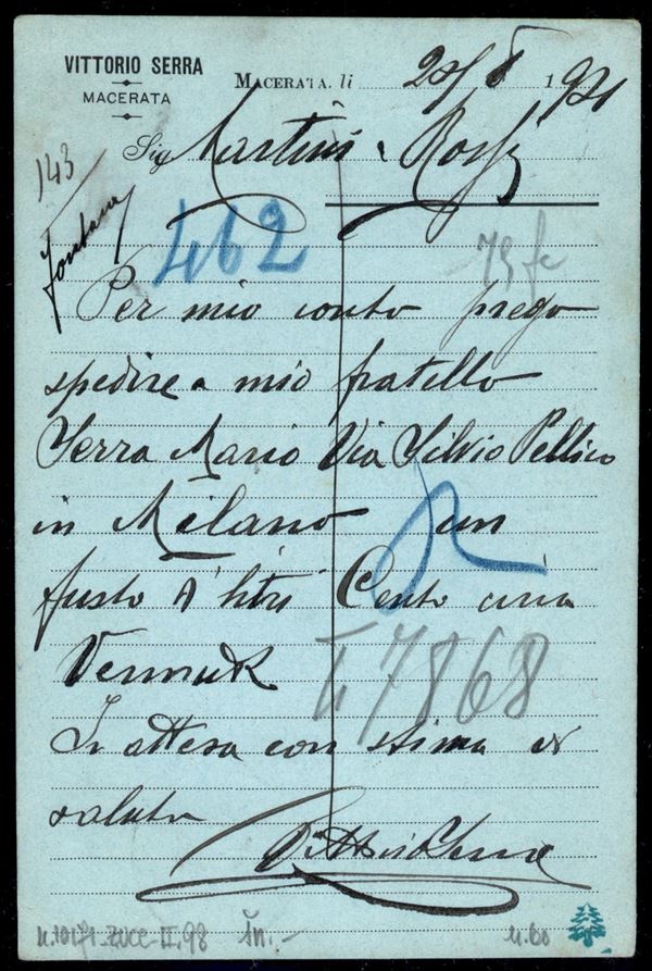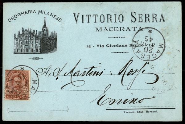 Cartolina commerciale affrancata con 10 cent Umberto I (60) isolato da Macerata per Torino del 20.8.01 - ex coll. Provera