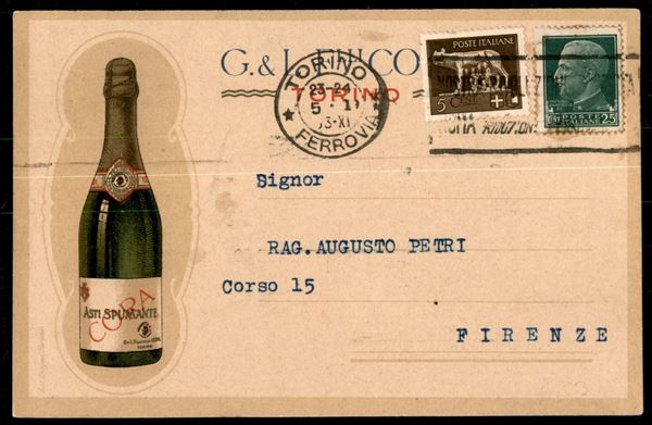 Cartolina commerciale affrancata con 5 cent + 25 cent Imperiale (243 + 248) da Torino per Firenze del 5.1.33 - ex coll. Provera