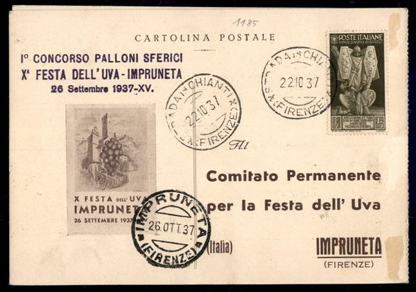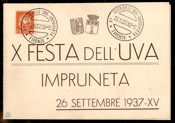 Cartolina doppia per Festa dell'Uva Impruneta con bolo dell'evento su 2 cent Imperiale (242A) + 15 cent Augusto (417) sulla cartolina per partecipare al concorso - da Radda in Chianti del 22.10.37 - ex coll. Provera