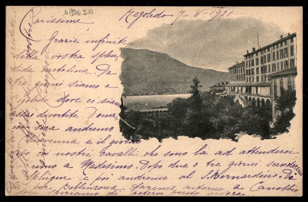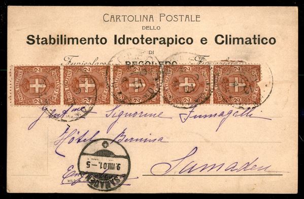 Cartolina paesaggistica affrancata con striscia verticale di cinque del 2 cent Stemma (66) da Regoledo per Samaden (Svizzera) del 7.8.01 - ex coll. Provera