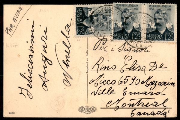 Cartolina per via aerea affrancata con tre 25 lire Catalani (740) da Provvidenti per Montreal (Canada) del 17.8.54
