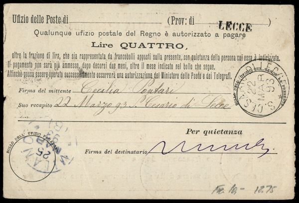 Cartolina Vaglia 10 cent da lire 4 (V5) con valore gemello 10 cent Umberto I (38) + coppia del 20 cent Umberto I (39) da S. Cesario di Lecce del 22. mar. 93