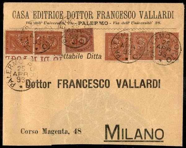 Due coppie + singolo 2 cent Vitt. Em. II + 10 cent Umberto I (15 + 38) su lettera da Palermo per Milano del 25 apr. 93