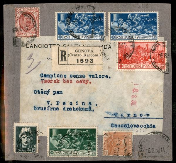 Etichetta di campione senza valore raccomandato per la Cecoslovacchia da Genova 6.8.30 a Tumov affrancato con 20 cent + 25 cent + due 1,25 lire + 15 cent + 75 cent + 15 cent - bella affrancatura multicolore con valori gemelli da 15 cent