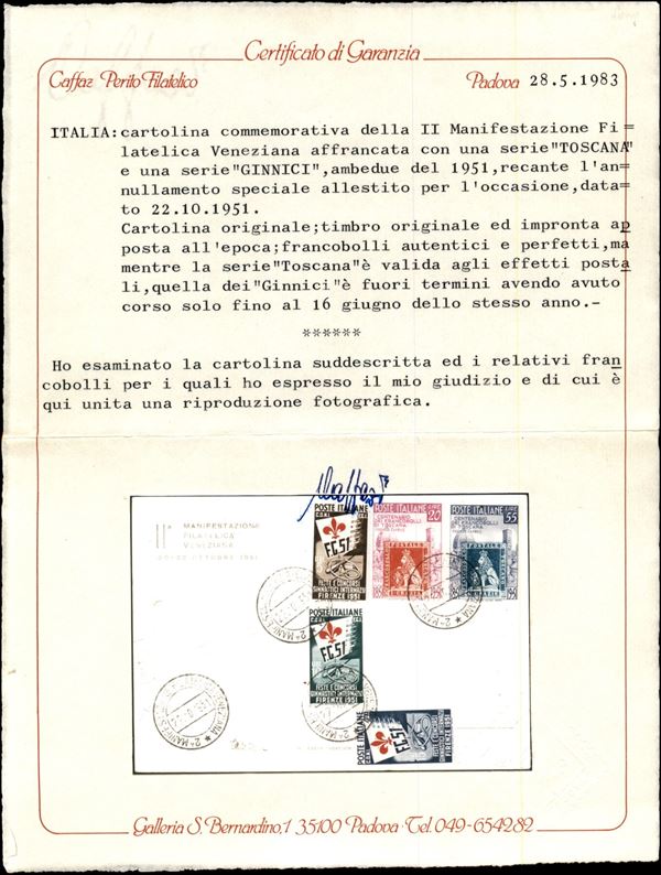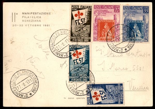 Ginnici (661/663) + Toscana (653/654) su cartolina della Manifestazione Filatelica Veneziana - Venezia 22.10.51 - Biondi + cert. Caffaz