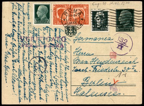 Intero postale da 15 cent (C79) con gemello (246) e complementari 25 cent Imperiale (247) + 20 cent Fratellanza (453) da Roma per Berlino 17.11.41