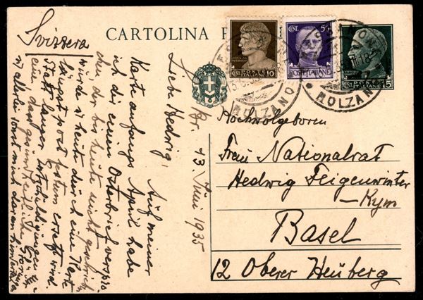 Intero postale da 15 cent (C79) tricolore con affrancatura complementare da 10 cent + 50 cent Imperiale (245 + 251) da Bolzano per Basilea del 13.6.35