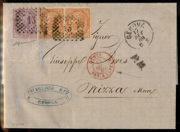 Lettera per la Francia affrancata con 60 cent + coppia 10 cent (17 + 21) - da Genova per Nizza Marittima del 17 set. 69