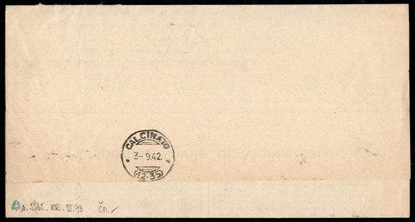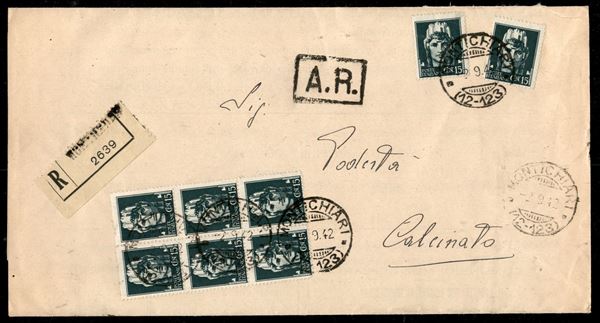 Lettera raccomandata A.R. affrancata con blocco di sei + due singoli del 15 cent Imperiale (246) da Montichiari a Calcinato del 2.9.42 - ex coll. Provera