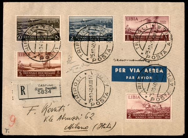 Mostra Triennale d'Oltremare - aerogramma raccomandato affrancato con 2 + 0,75 lire (170) + serie Posta Aerea (41/44) da Tripoli a Milano del 25.10.40 - non comune - Raybaudi