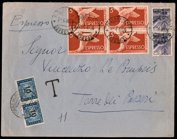 Quartina 5 lire Espressi + coppia verticale 6 lire Democratica su espresso da Pescara a Torre de'Passeri del 2.4.48 tassata in arrivo con coppia 10 lire Segnatasse