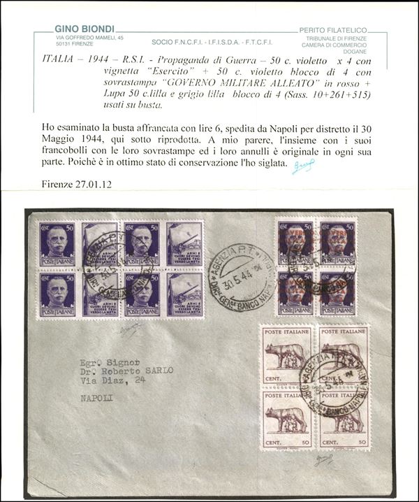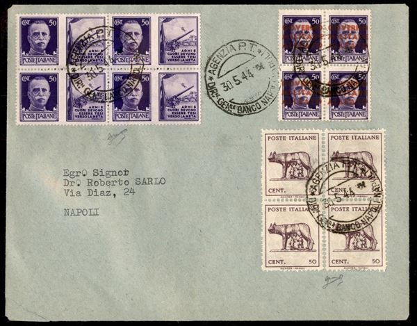Quartina del 50 cent Lupa (515) + quartina del 50 cent Propaganda (10) + quartina del 50 cent Governo Militare Alleato (12) su busta - Napoli 30.5.44 - Biondi