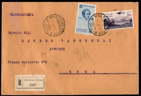 Raccomandata affrancata con 1 + 1 lira Bimillenario Oraziano (98) + 1,25 lire Bellini (391) da Minervino Murge a Roma del 7.10.36 - Biondi + Diena