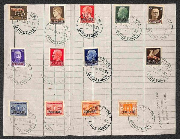 Soprastampati (1/8 + Aerea 1 + Segnatasse 1/4) - 13 valori usati su foglietto a Corfù nel 1943