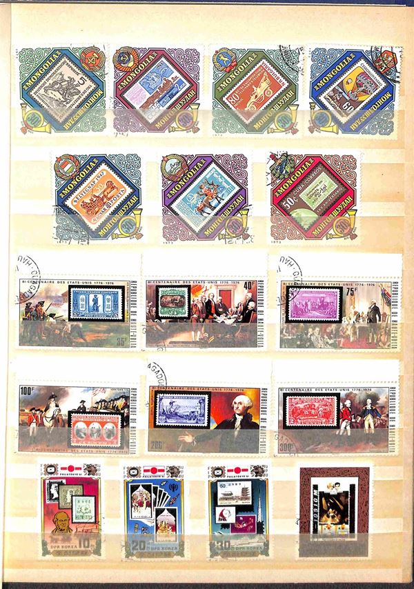 TEMATICA - Giornata del Francobollo - Collezione di circa 150 francobolli principalmente usati + 4 foglietti e 9 buste montati in classificatore - da esaminare
