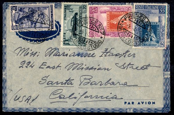 Toscana (653/654) + Salone Automobile (655) + complementare (642) - aerogramma da Firenze per la California del 5.4.51
