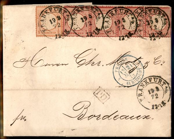 ½ grosche (14) + striscia di 4 del 1 groschen appena difettosa a destra sul bordo (15)- lettera da Francoforte a Bordeaux del 19.3.72 - prima data conosciuta per il ½ groschen
