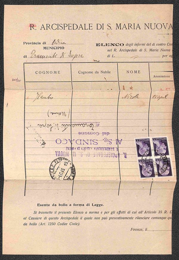 1 lira (531) in quartina su piego ospedaliero da Firenze a Udine del 4.6.45