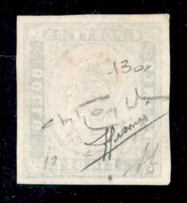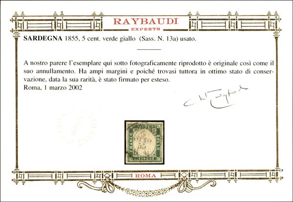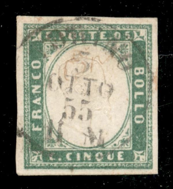1855 - 5 cent verde giallo (13a) - ben marginato - usato - Sorani + cert. Oro Raybaudi (10.000)