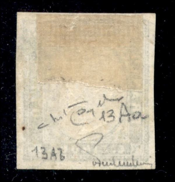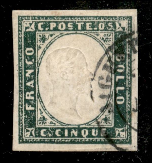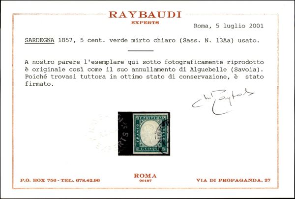 1857 - 5 cent verde mirto (13Aa) - usato - cert. Raybaudi (2.000)