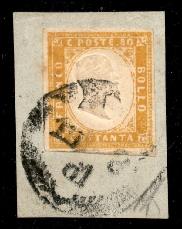 1861 - 80 cent giallo arancio (17C) su frammento - Raybaudi (850)