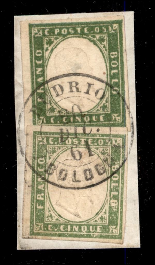 1861 - Due esemplari del 5 cent verde oliva grigiastro e verde oliva giallastro (13Cb + 13Cc) su frammento annullati con doppio cerchio Budorio - Bologna 30 dic. 61 - entrambi ottimi margini