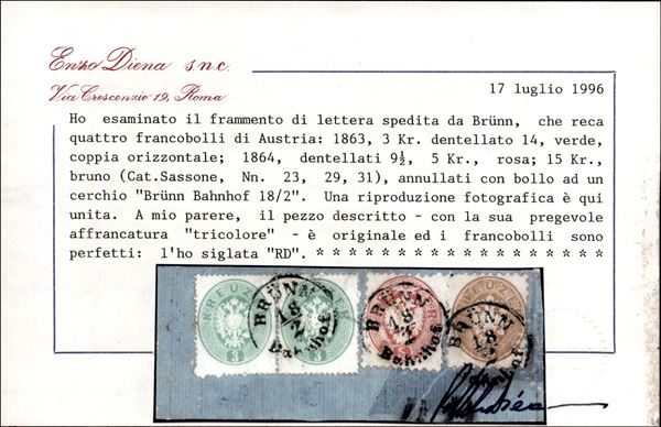 1863 - 26 kreuzer su frammento di lettera spedita da Brunn il 18.2 -cert Diena (23+29+31)